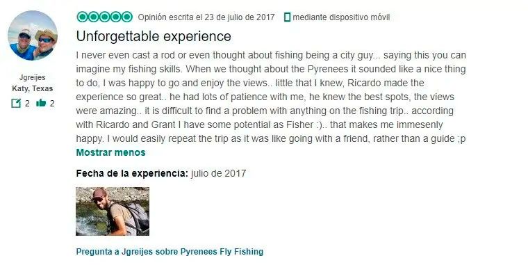 “I am a passionate fly fisher and have fished all over the world for a variety of species. My day in the Pyrenees ranks among one of the most memorable. I highly recommend everyone make this a part of their Spanish vacation. The scenery is surreal – one of the most beautiful places I’ve ever been, the fishing is fantastic – it was a dream of mine to catch native Spanish brown trout and they are some of the most beautiful fish on the planet, and Adrian and Ricardo are two of the most thoughtful and knowledgable guides I have ever met. Thank you for an amazing experience, I will be back! “ Will Travis_Texas (19/6/2016)